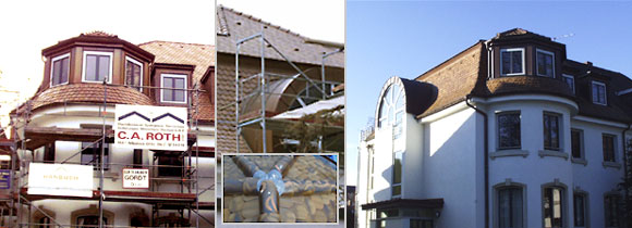 Wohnhausneubau, Eindeckung mit Biberschwanzziegel Doppeldeckung "Antik". Dachentwässerung und Abdeckungen in Kupfer.
